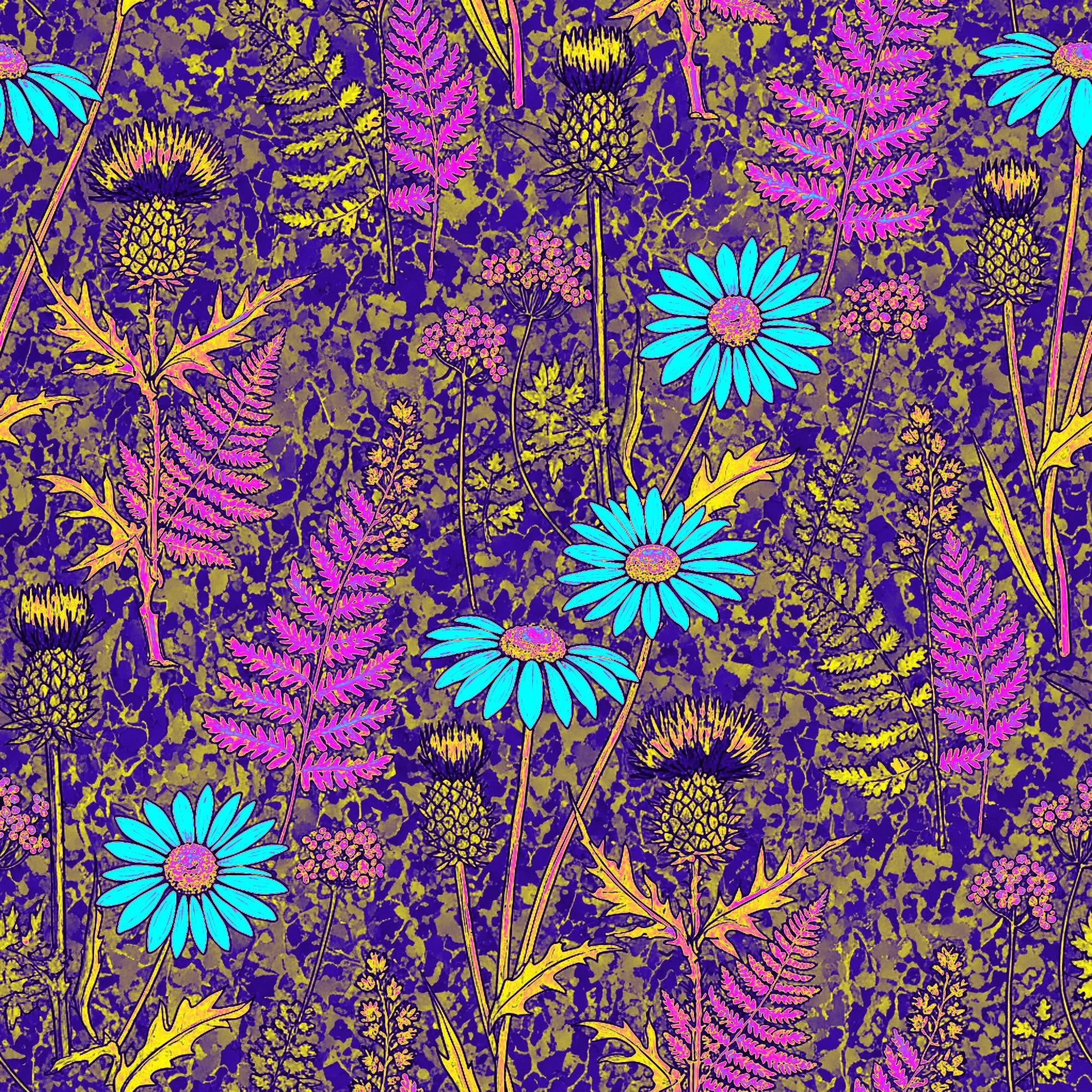 Nature engineered. Intricate blueprint-style ferns and thistles float with minimalist grace, striking a bold harmony in midnight bordeaux, cardinal red, lapis lazuli, and sunlit citrine. Generated by So Next Year AI Engine