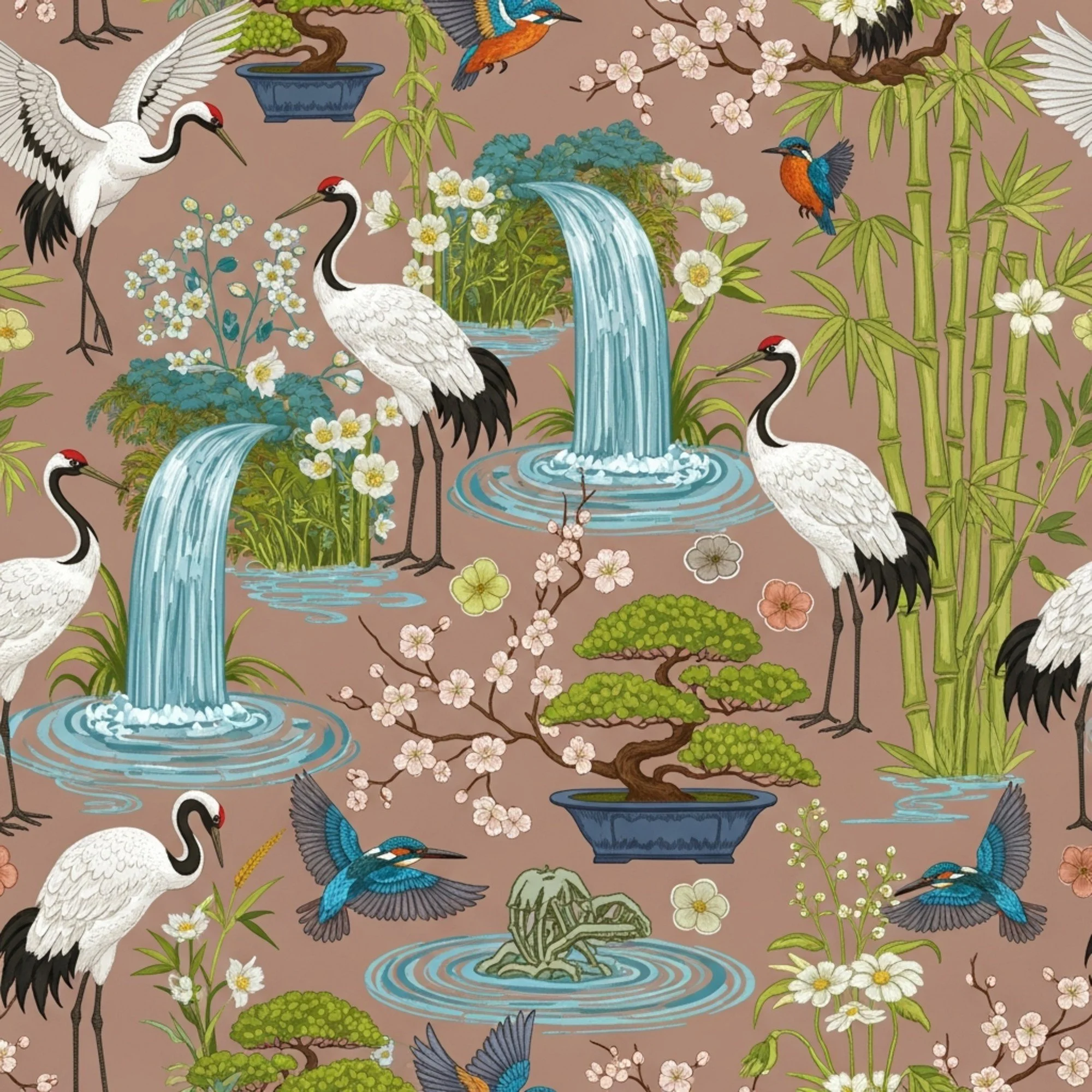 This flowing design features luxurious Siamese and Maine Coons nestled among lush flora. Rendered in Pali Mist, Volcanic Clay, and Koa Wood Ink, this 8k detailed print creates breathtaking custom upholstery or continuous wallcovering. Generated by So Next Year AI Engine