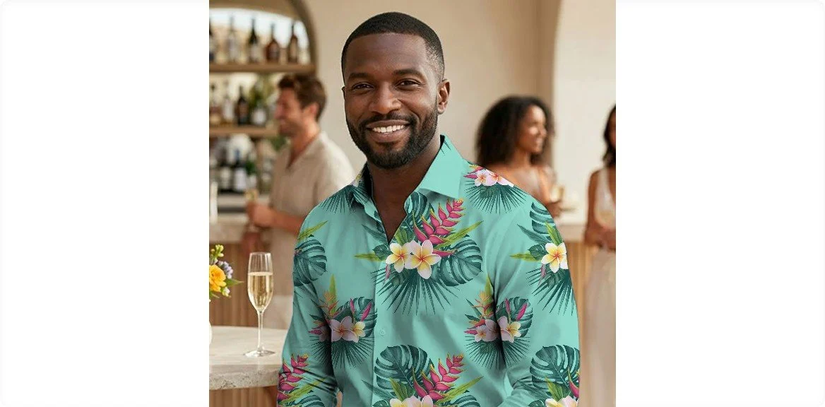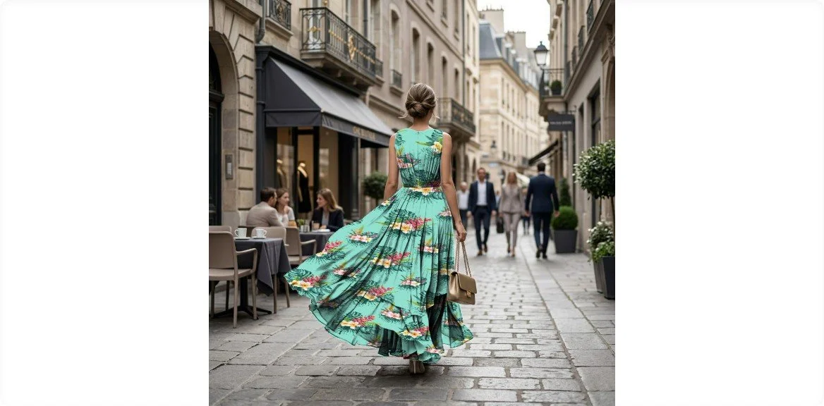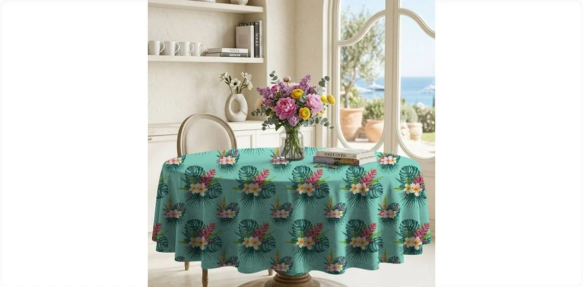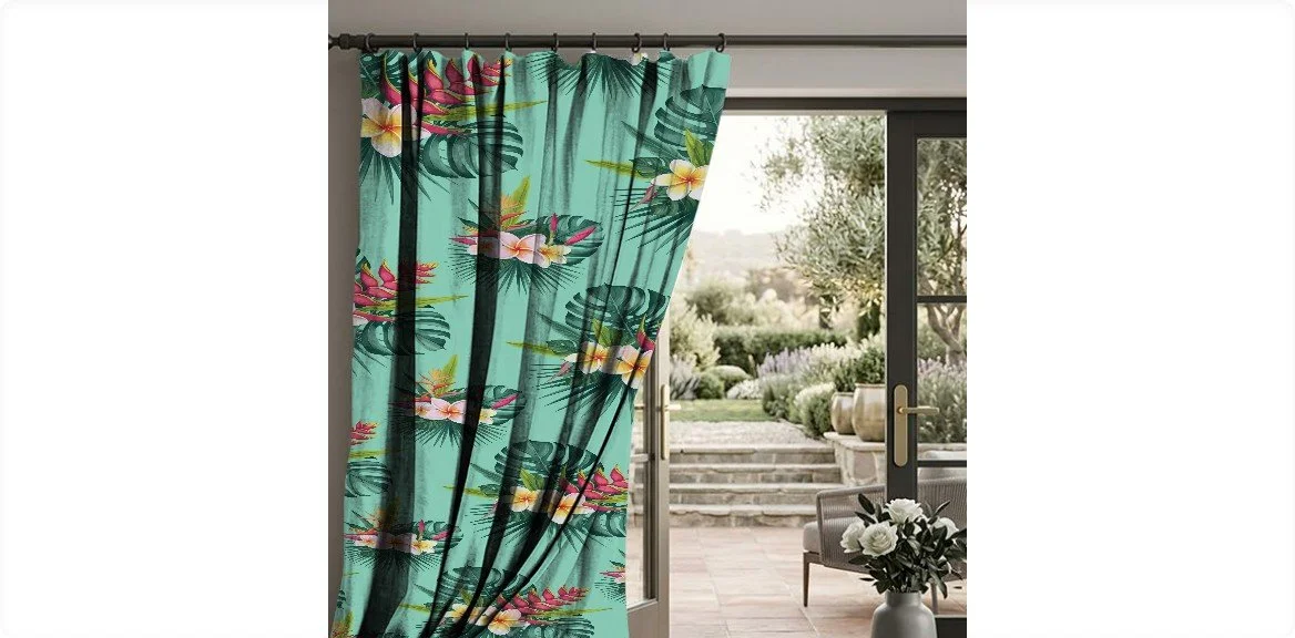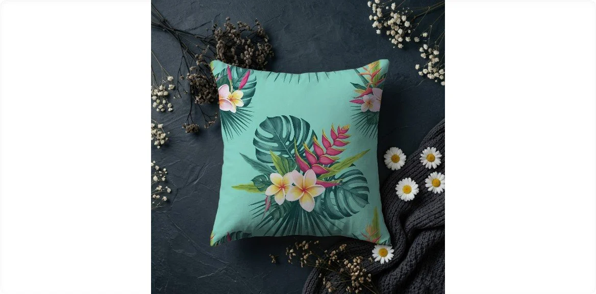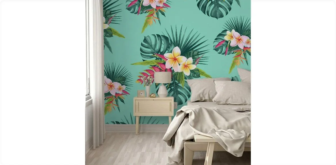 An opulent reverie of a private atoll. Lacquered leaves brush against shocking pink blossoms, their graphic beauty floating on a crystalline aqua pool. Surrender to this lush, couture oasis.