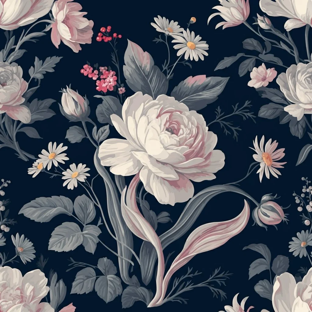 Transform your sanctuary with our deep navy botanical wallpaper. Hand-drawn, watercolor-inspired florals bring timeless Rococo elegance and a dreamy, seamless flow to any contemporary living space.