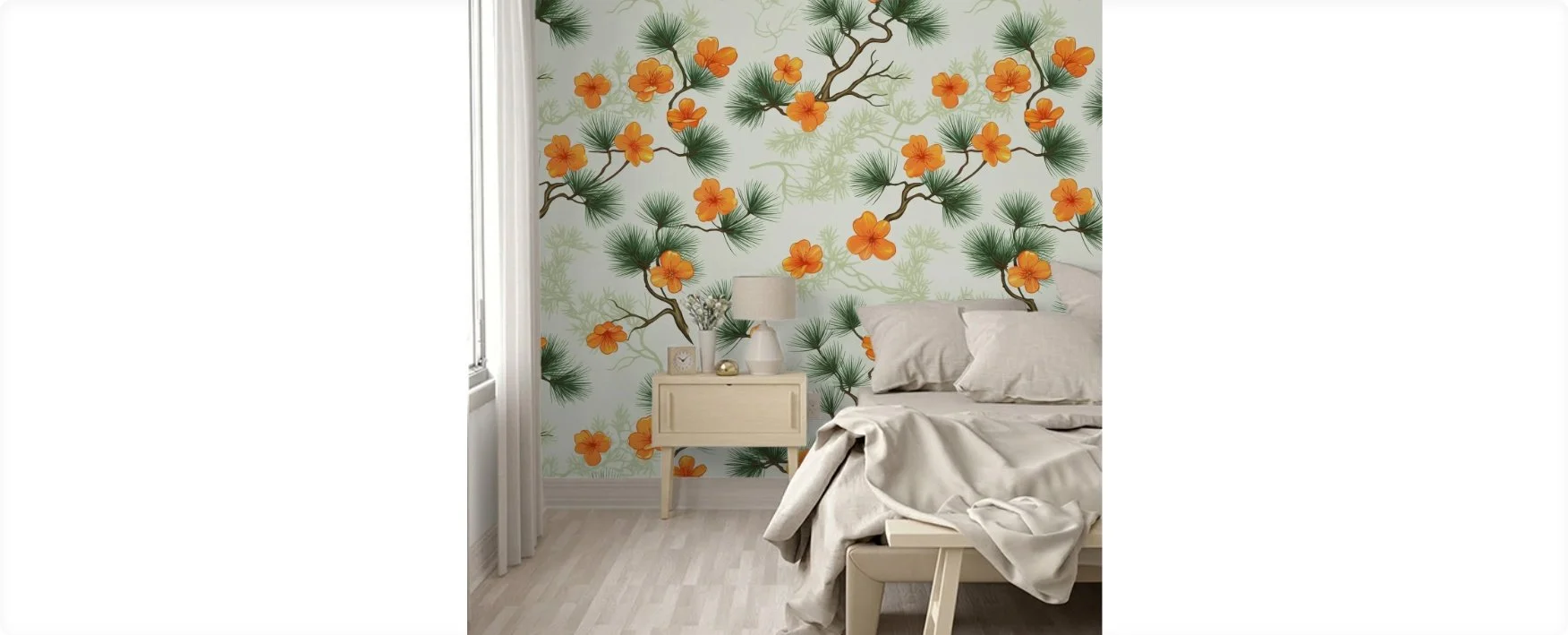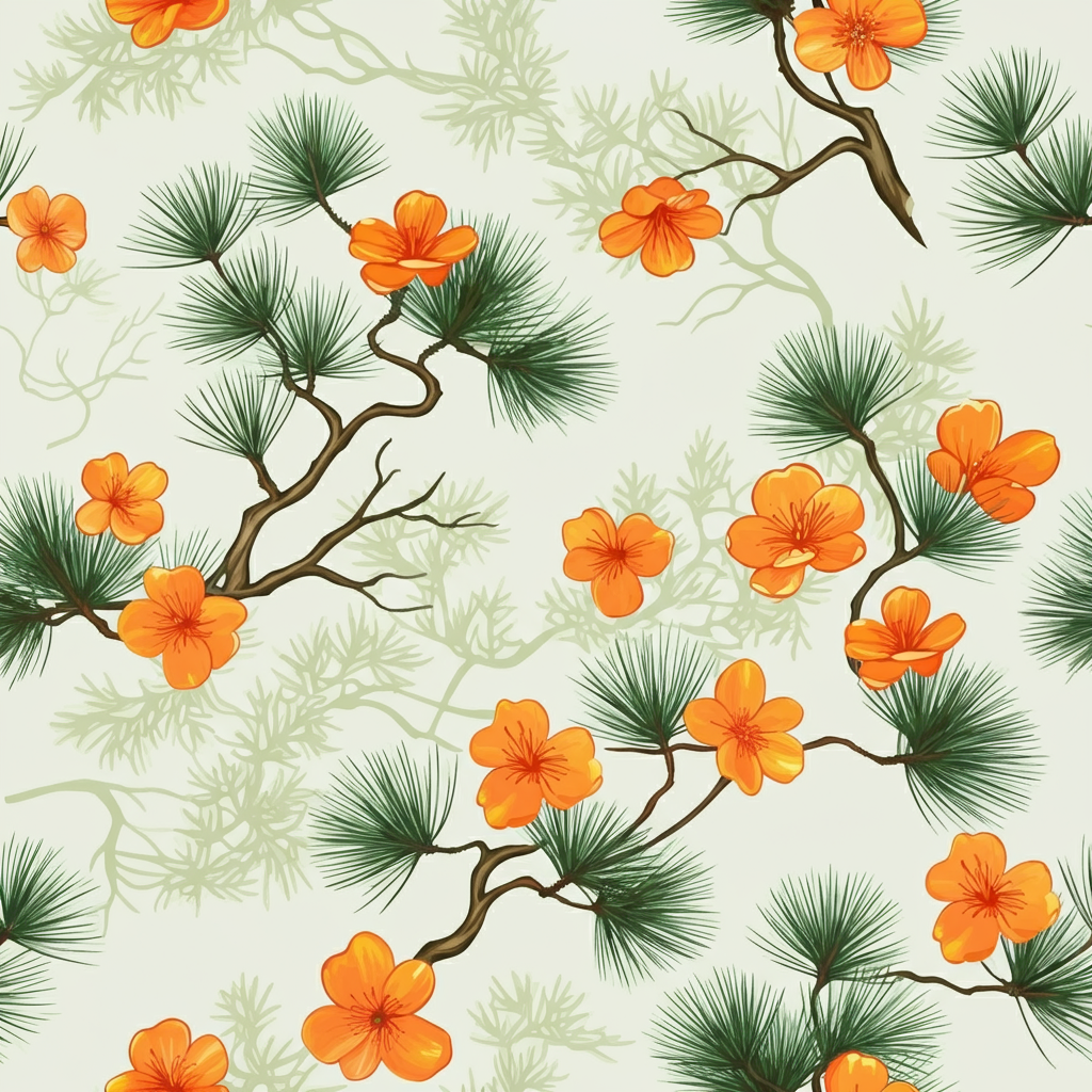 Elevate your gifting with a painterly botanical landscape. Crisp pine needles and vibrant blooms dance across this seamless, East Asian-inspired design for a touch of organic sophistication.